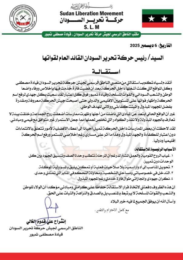 استقالة مفاجئة للناطق الرسمي لجيش حركة تحرير السودان