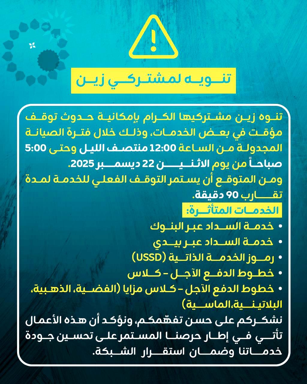 وتوقعت الشركة أن يستمر التوقف الفعلي للخدمة لمدة تقارب 90 دقيقة. وأوضحت أن الخدمات المتأثرة هي “خدمة السداد عبر البنوك، خدمة السداد عبر بيدي، رموز الخدمة الذاتية (USSD)، خطوط الدفع الآجل- كلاس، وخطوط الدفع الآجل- كلاس مزايا (الفضية، الذهبية، البلاتينية، الماسية)”.