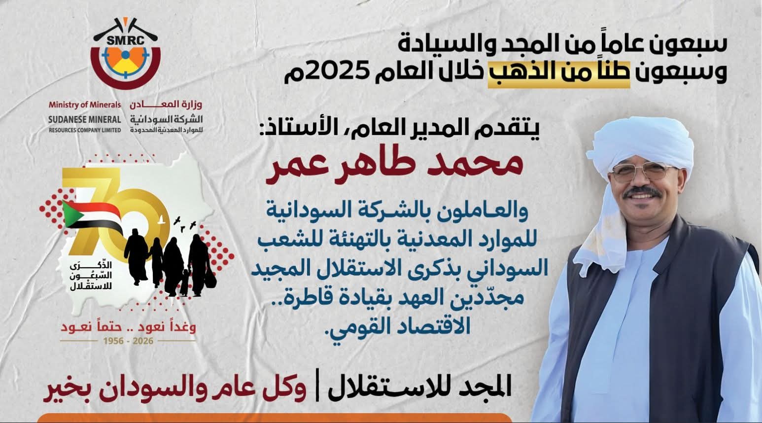 سبعون عاماً من المجد و70 طن من الذهب.. مدير الموارد المعدنية يهنئ بذكرى الاستقلال