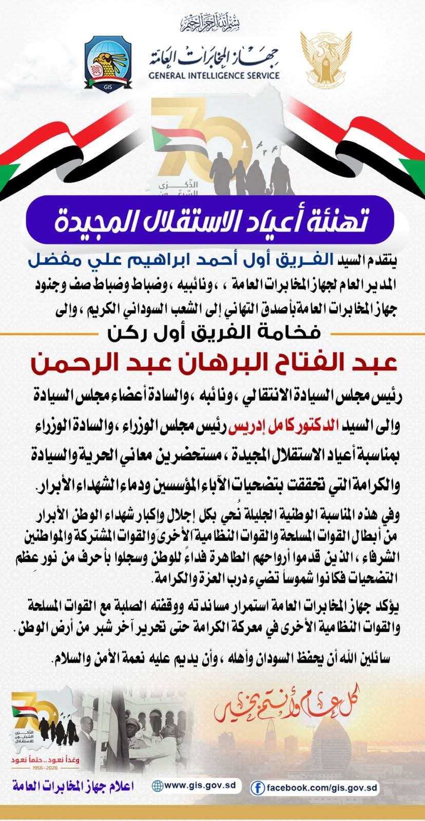 بورتسودان: النورس نيوز- تقدّم المدير العام لجهاز المخابرات العامة، ونائبيه، وضباط وضباط صف وجنود جهاز المخابرات العامة، بأصدق التهاني والتبريكات إلى الشعب السوداني الكريم، وإلى الفريق أول ركن عبد الفتاح البرهان رئيس مجلس السيادة الانتقالي، ونائبه، وأعضاء مجلس السيادة، وإلى الدكتور كامل إدريس رئيس مجلس الوزراء، والوزراء، بمناسبة أعياد الاستقلال المجيدة، مستحضرين معاني الحرية والسيادة والكرامة التي تحققت بتضحيات الآباء المؤسسين ودماء الشهداء الأبرار.