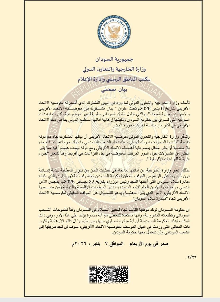 وأشارت الوزارة إلى أن البيان أغفل الموقف المعلن لحكومة السودان بشأن وقف إطلاق النار، لافتة إلى أن رئيس مجلس الوزراء كان قد أعلن مبادرة رسمية لوقف إطلاق النار بتاريخ 22 ديسمبر 2025، والتي حظيت بدعم الأمين العام للأمم المتحدة، ومجلس الأمن، وعدد من المنظمات الإقليمية والدولية.