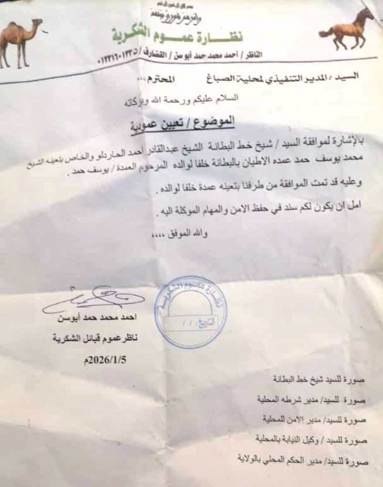 وبعث ناظر عموم قبائل الشكرية الناظر أحمد محمد حمد أبو سن، بخطاب إلى المدير التنفيذي لمحلية الصباغ، مشيراً فيه إلى موافقة شيخ خط البطانة الشيخ عبد القادر أحمد الحاردلو والخاص بتعيين الشيخ محمد يوسف حمد عمدة الأطيان بالبطانة خلفا لوالده المرحوم العمدة يوسف حمد، مؤكداً أنه تمت الموافقة من طرفهم بتعيينه عمدة خلفا لوالده، متمنياً أن يكون سنداً في حفظ الأمن والمهام الموكلة إليه.
