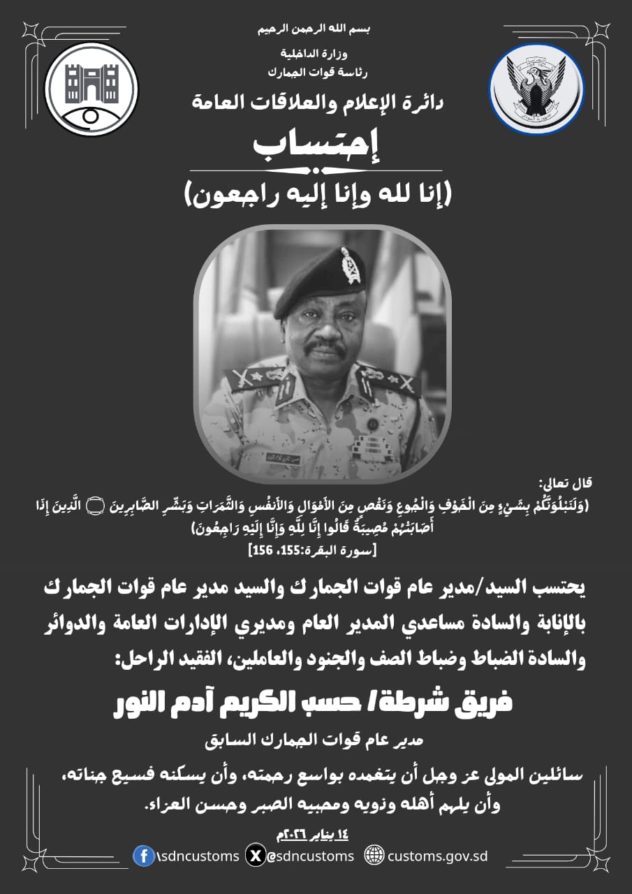 لقد فقدت قوات الجمارك برحيله قامةً وطنيةً وإداريةً سامقة، أسهمت بصدقٍ وإخلاص في تطوير وتحديث العمل الجمركي، وشهدت فترته تطوراً وازدهاراً ملحوظين. وكان الفقيد من أوائل المبادرين بنقل رئاسة قوات الجمارك إلى مدينة بورتسودان، حرصاً على استمرارية العمل الجمركي، وصون مقدرات وأملاك الدولة في أحلك الظروف.
