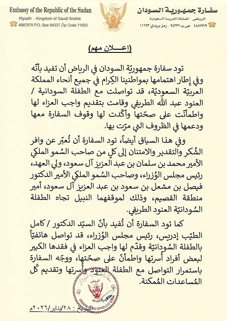 وقالت السفارة، في بيانها الصادر من مقرها بالعاصمة الرياض، إنها وضمن إطار حرصها المتواصل على رعاية شؤون المواطنين السودانيين المقيمين في مختلف مناطق المملكة، قامت بالتواصل المباشر مع أسرة الطفلة العنود الطريفي، وقدّمت لهم واجب العزاء والتعازي الصادقة في المصاب الجلل، مؤكدة وقوفها الكامل إلى جانب الطفلة وأسرتها في هذه الظروف الإنسانية الصعبة التي تمر بها.