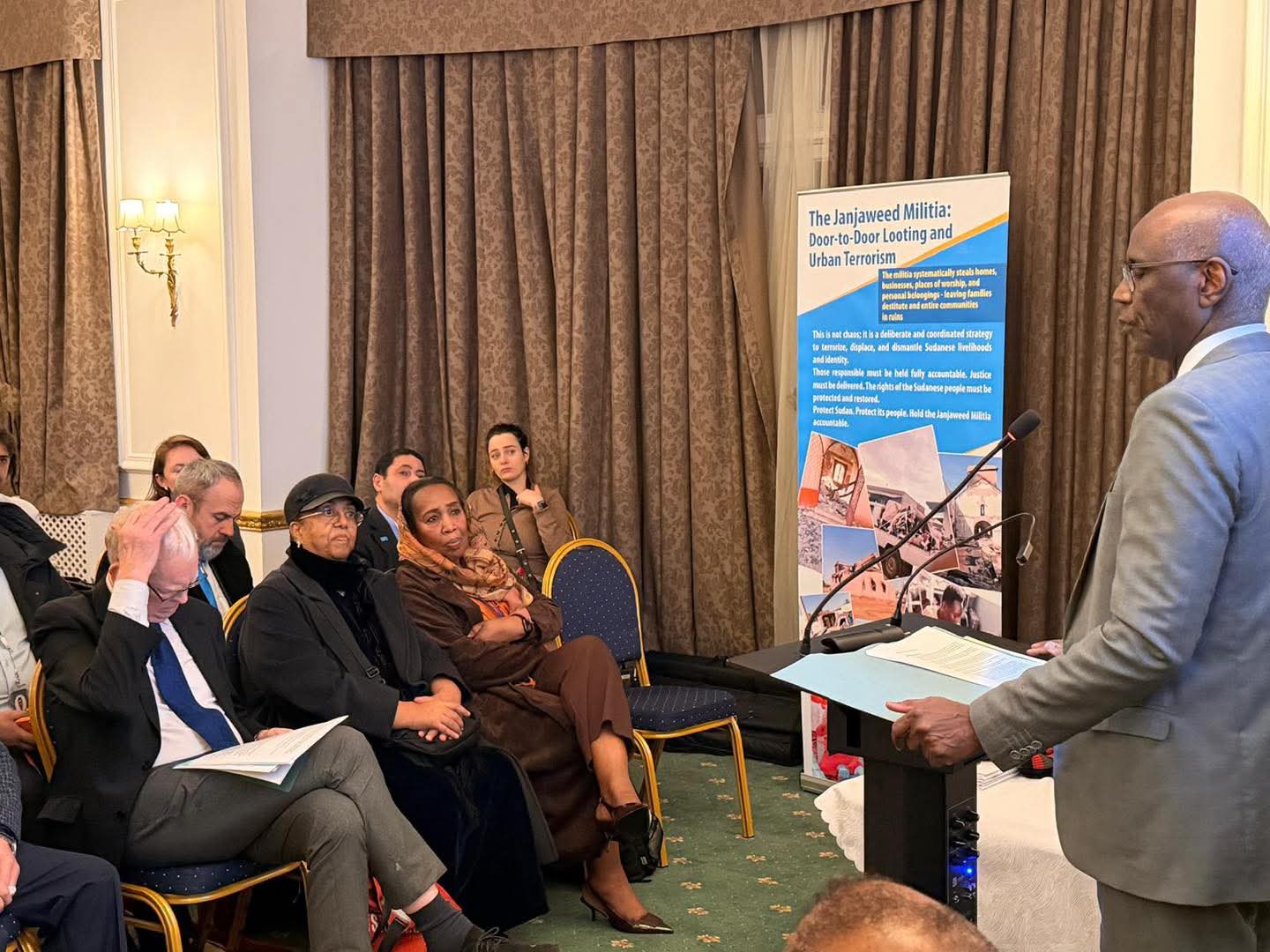 من جانبه، دعا السيد ديفيد واردروب، رئيس جمعية الأمم المتحدة – ويستمنستر، إلى الاستماع للرواية السودانية الرسمية المستندة إلى الوقائع، مطالباً المجتمع الدولي، لا سيما الأمم المتحدة، بدور أكثر فاعلية في حماية المدنيين وضمان احترام القانون الدولي الإنساني ومساءلة مرتكبي الجرائم. كما حذّر من التداعيات الإقليمية والدولية لاستمرار الأزمة الإنسانية في السودان، خاصة في مجالات الهجرة والأمن والاستقرار، مؤكداً ضرورة إعادة تمكين الأمم المتحدة للقيام بدورها في حفظ السلم والأمن الدوليين.