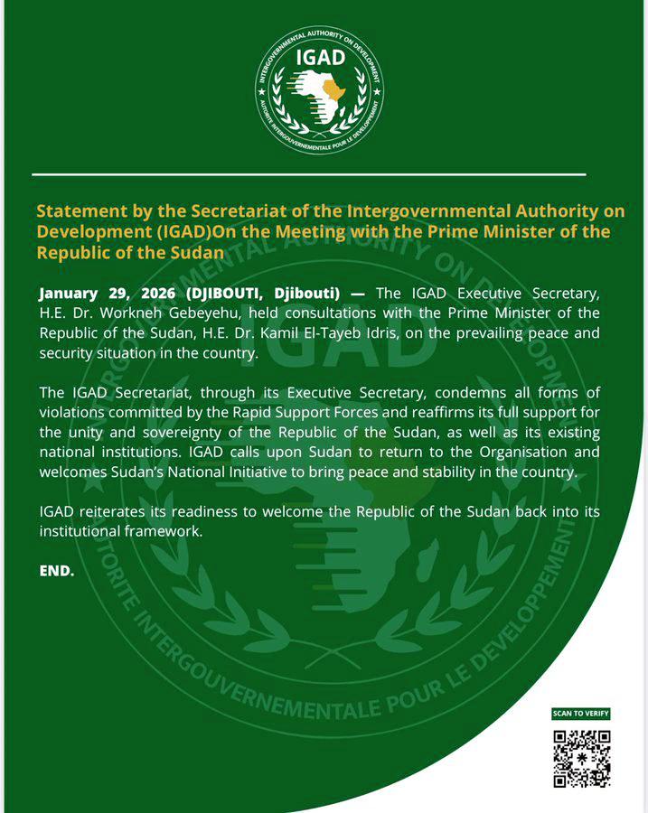 وجاء هذا التحول في موقف المنظمة الإقليمية عقب مباحثات رسمية أجريت في جيبوتي بين السكرتير التنفيذي للهيئة الدكتور ورقني قبيهو، ورئيس الوزراء الدكتور كامل إدريس، حيث استعرض اللقاء تطورات الأوضاع الراهنة في البلاد وسبل إنهاء الحرب واستعادة الاستقرار السياسي والمؤسسي.