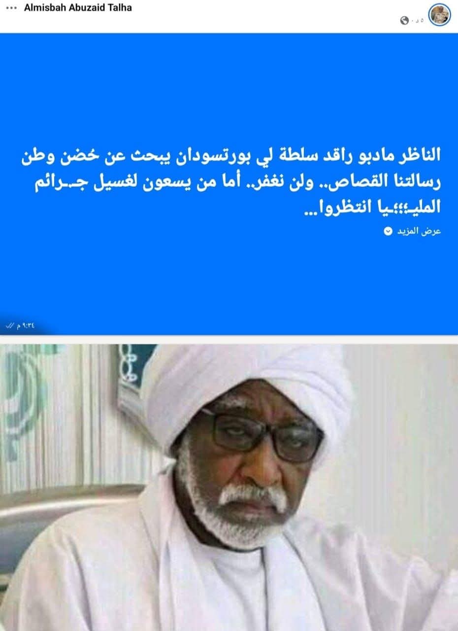 لمح قائد قوات البراء بن مالك، المصباح طلحة، في تغريدة نشرها على حسابه الرسمي في فيس بوك، إلى محاولة وصول ناظر قبائل الرزيقات، مادبو، إلى مدينة بورتسودان بهدف التوسط لإنهاء النزاع المسلح بين الجيش السوداني والدعم السريع.