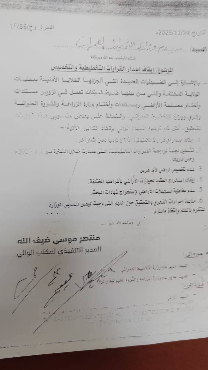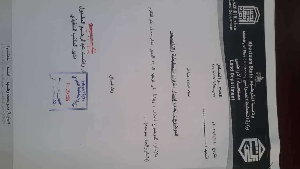 طلب المندوب تخليص إجراءات بيع قطعة الأرض، غير أن مدير الأراضي أبلغه بتوقف جميع إجراءات بيع الأراضي الاستثمارية، استناداً إلى قرار مكتوب صادر عن والي الخرطوم أحمد عثمان حمزة. وبحسب الشهود، غادر المندوب المكتب دون إتمام الإجراء.