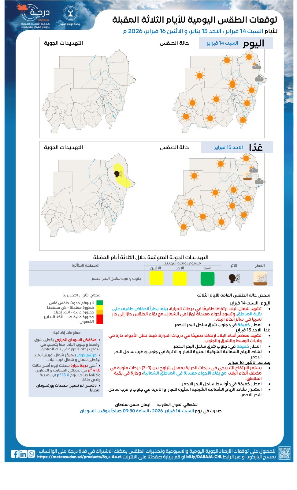 كما أشارت التوقعات إلى فرص لهطول أمطار خفيفة في جنوب شرق ساحل البحر الأحمر.