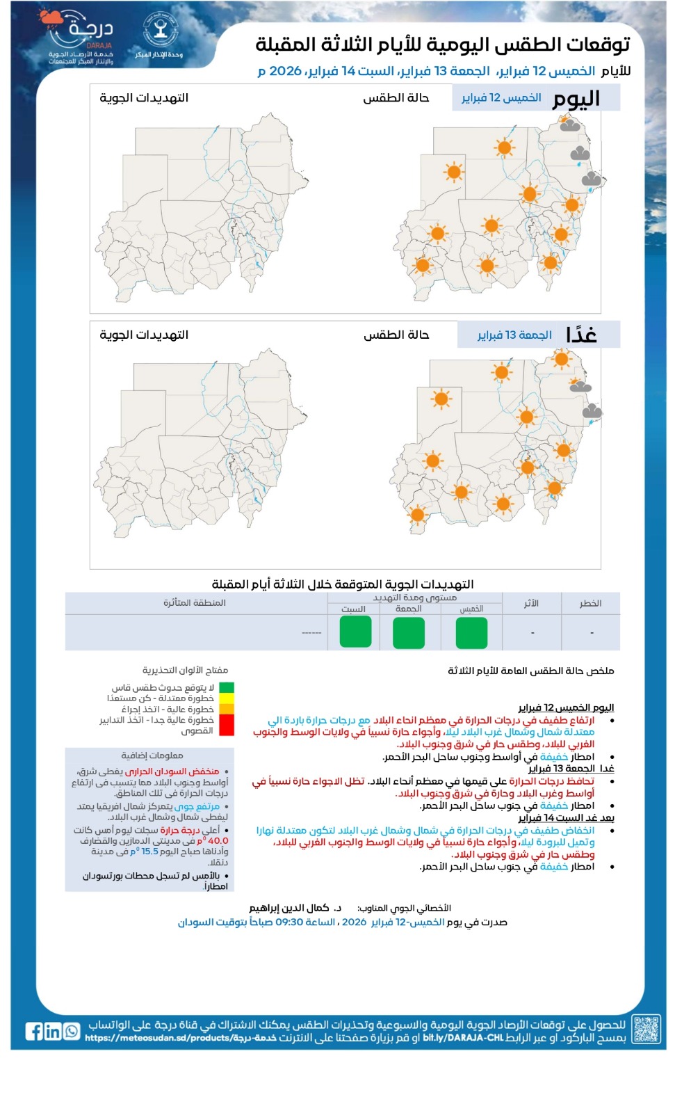 أفادت الهيئة العامة للأرصاد الجوية بحدوث انخفاض طفيف في درجات الحرارة في شمال البلاد، مع محافظتها على قيمها في بقية المناطق.