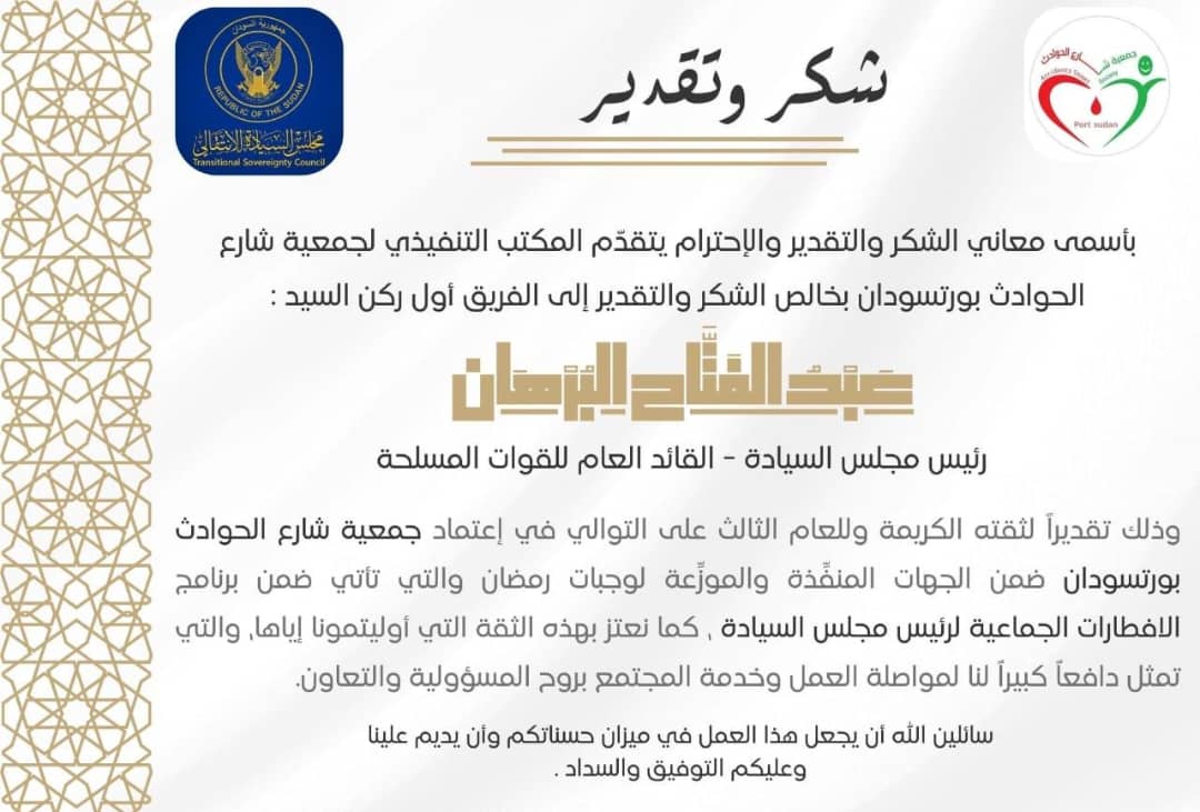 وذلك تقديراً لثقته الكريمة وللعام الثالث على التوالي في اعتماد جمعية شارع الحوادث بورتسودان ضمن الجهات المنفِّذة والموزِّعة لوجبات رمضان والتي تأتي ضمن *برنامج الإفطارات الجماعية لرئيس مجلس السيادة*