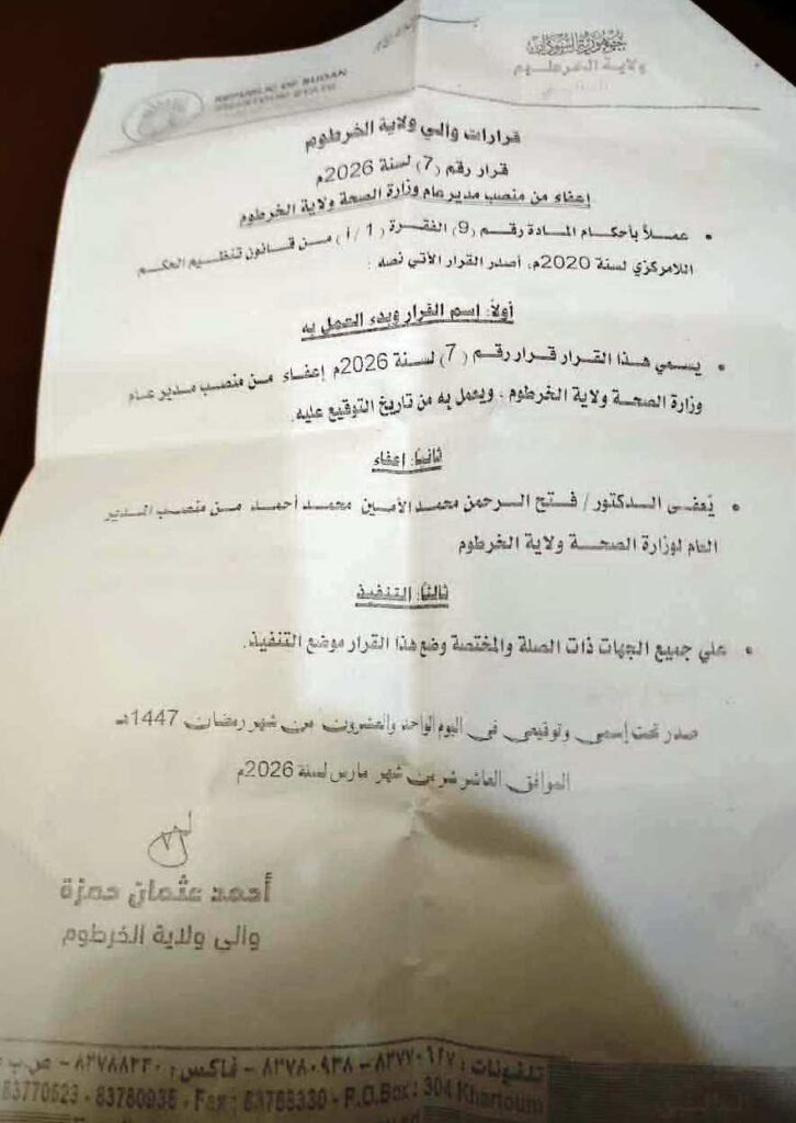 الخرطوم: النورس نيوز- أصدر والي ولاية الخرطوم أحمد عثمان حمزة، قراراً بإعفاء وزير الصحة المكلف بالولاية د. فتح الرحمن محمد الأمين محمد أحمد من منصب المدير العام لوزارة الصحة بالولاية، الوزير المكلف.