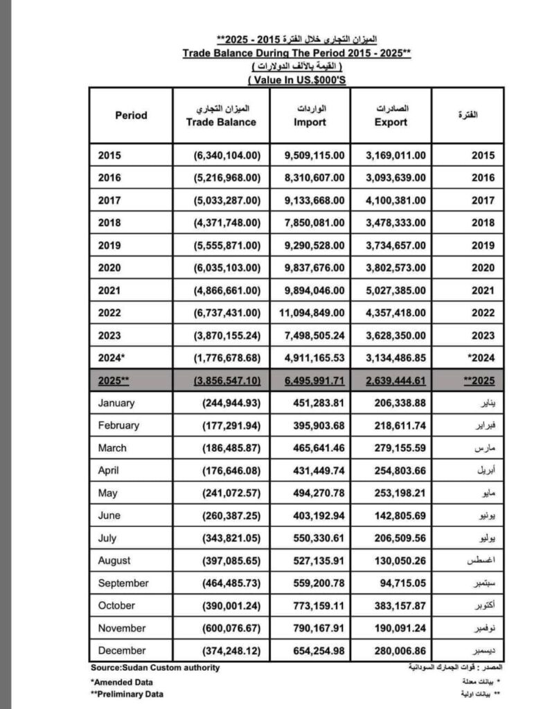 الخرطوم: النورس نيوز- كشف بنك السودان المركزي، عن ارتفاع كبير في عجز الميزان التجاري للبلاد خلال العام 2025، حيث وصل إلى 3.8 مليار دولار.