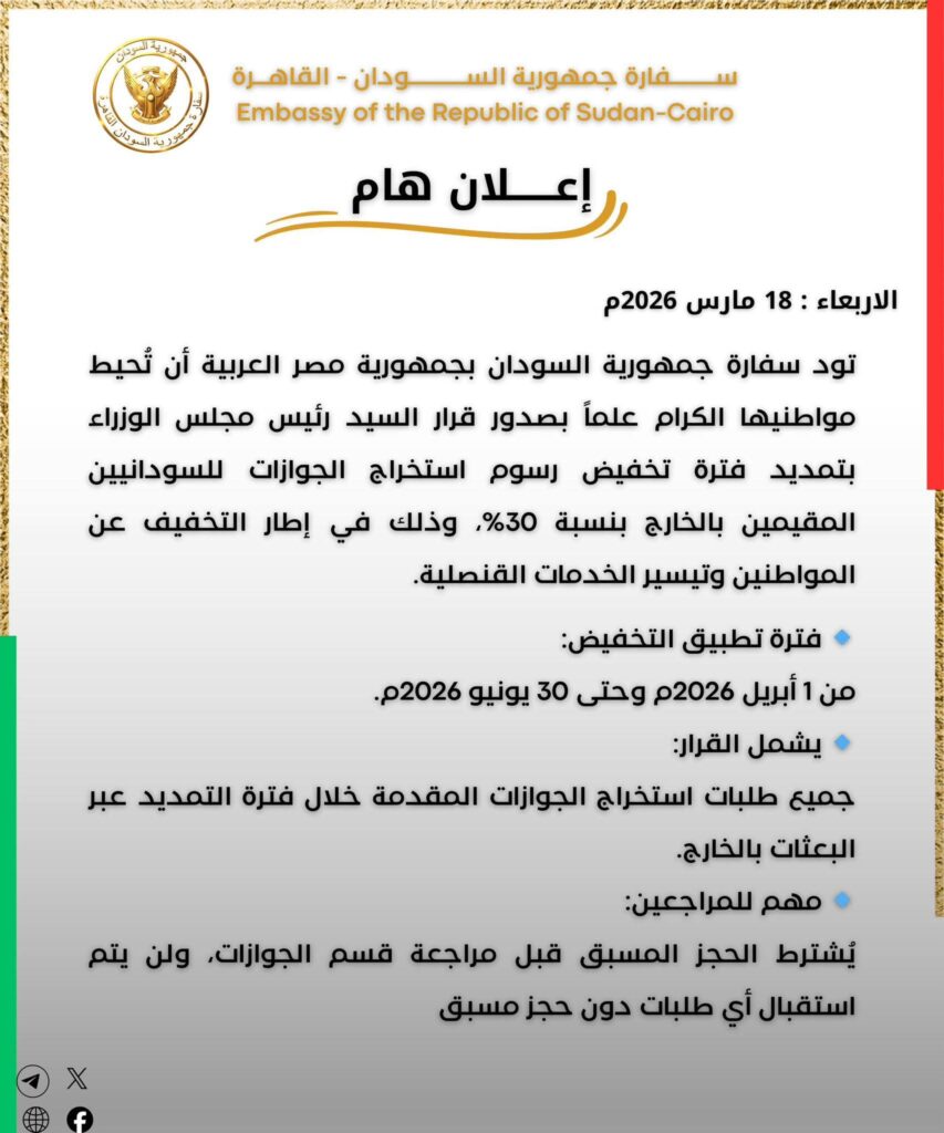 أعلنت سفارة جمهورية السودان لدى جمهورية مصر العربية، اليوم الأربعاء 18 مارس 2026، عن صدور قرار رسمي من رئيس مجلس الوزراء يقضي بتمديد العمل بتخفيض رسوم استخراج الجوازات للسودانيين المقيمين خارج البلاد بنسبة 30%، في خطوة تهدف إلى تخفيف الأعباء المالية وتيسير الحصول على الخدمات القنصلية.