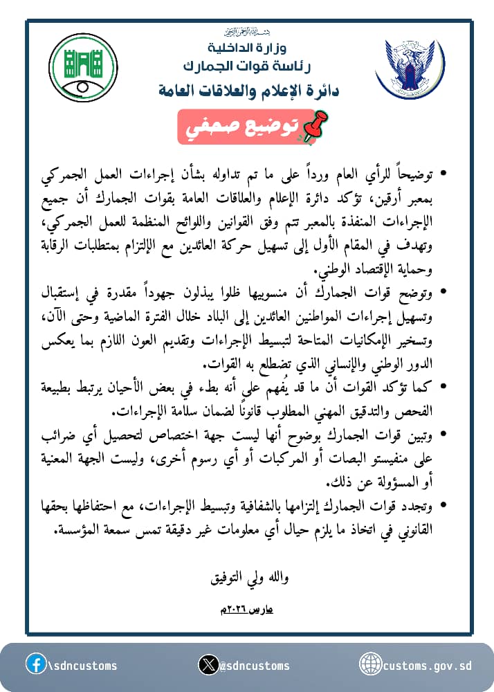 أصدرت قوات الجمارك السودانية توضيحاً صحفياً بشأن ما تم تداوله مؤخراً حول إجراءات العمل الجمركي في معبر معبر أرقين، مؤكدة أن جميع الإجراءات المتبعة تتم وفق القوانين واللوائح المنظمة، وتهدف إلى تسهيل حركة المواطنين العائدين، مع الالتزام الكامل بمتطلبات الرقابة وحماية الاقتصاد الوطني.