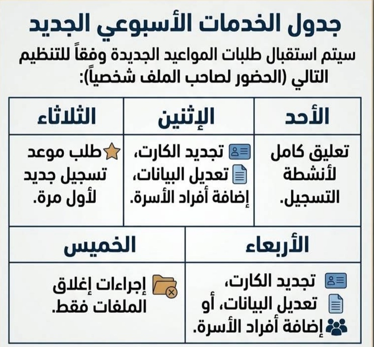 وكشفت أنه سيتم التعامل مع جميع طلبات المواعيد الجديدة للتسجيل كالتالي: “الأحد: لا توجد مواعيد- الإثنين: طلب موعد لتجديد الكارت أو تعديل بيانات الملف أو اضافة أحد أفراد الأسرة (من خلال صاحب الملف فقط)- الثلاثاء: طلب موعد تسجيل جديد (من خلال صاحب الملف فقط)- الأربعاء: طلب موعد لتجديد الكارت أو تعديل بيانات الملف أو اضافة أحد أفراد الأسرة (من خلال صاحب الملف فقط)- والخميس: إغلاق الملف (من خلال صاحب الملف فقط)”.