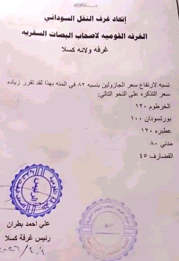 ووفقاً للكشوفات الرسمية الصادرة عن رئيس الغرفة علي أحمد بطران، وصلت قيمة التذكرة من كسلا إلى كل من الخرطوم وعطبرة إلى 120 ألف جنيه سوداني، بينما تم تحديد سعر تذكرة بورتسودان بـ100 ألف جنيه، ومدينة ود مدني بـ80 ألف جنيه، في حين بلغت تعرفة السفر إلى القضارف 45 ألف جنيه.