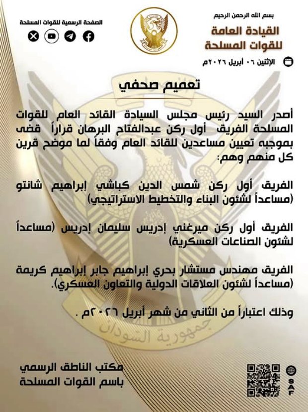 الخرطوم: النورس نيوز- أصدر رئيس مجلس السيادة، القائد العام للقوات المسلحة الفريق أول الركن عبد الفتاح البرهان، قراراً قضى بتعيين ثلاثة مساعدين جدد للقائد العام، وذلك اعتباراً من الثاني من أبريل 2026م.