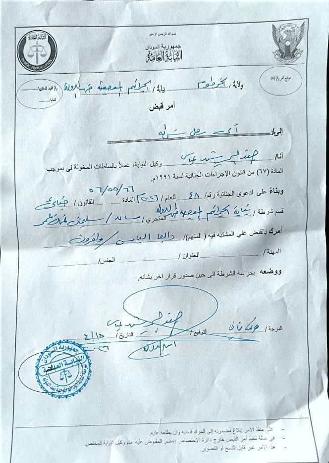 النورس نيوز _ أصدرت نيابة أمن الدولة في السودان قراراً يقضي بإصدار أمر قبض في مواجهة الصحفية داليا الياس وعدد من الأشخاص الآخرين، وذلك على خلفية بلاغ مسجل بالرقم (48 / 2026)، يتعلق بمواد في القانون الجنائي السوداني لسنة 1991.
