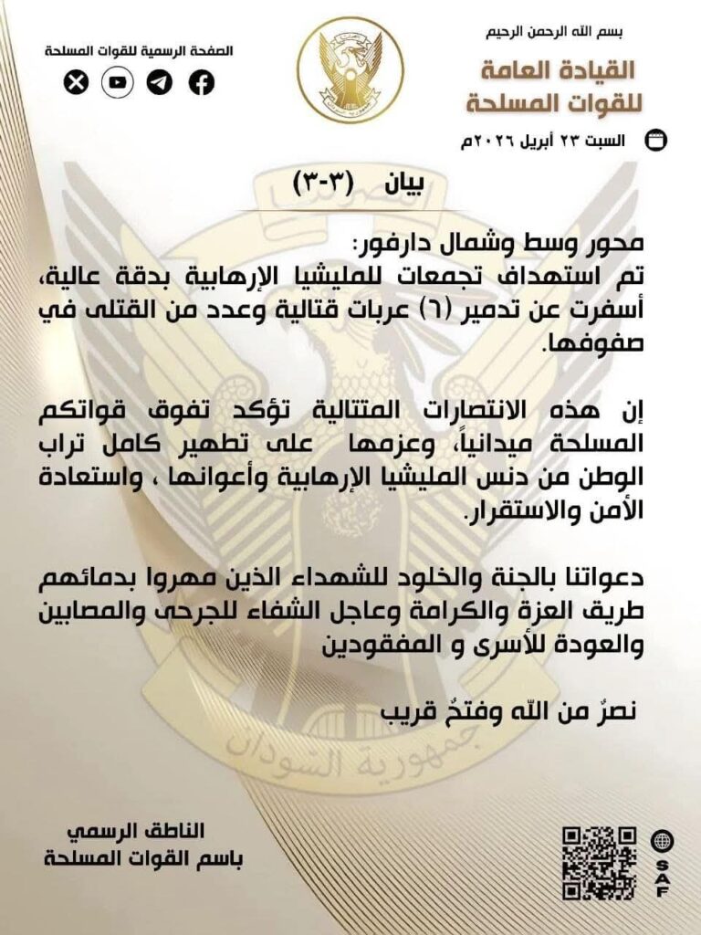 وأكدت القوات المسلحة أن هذه العمليات تعكس “تفوقاً ميدانياً متواصلاً”، وتعزز، بحسب البيان، جهودها نحو ما وصفته بتطهير كامل التراب الوطني من التمرد.
