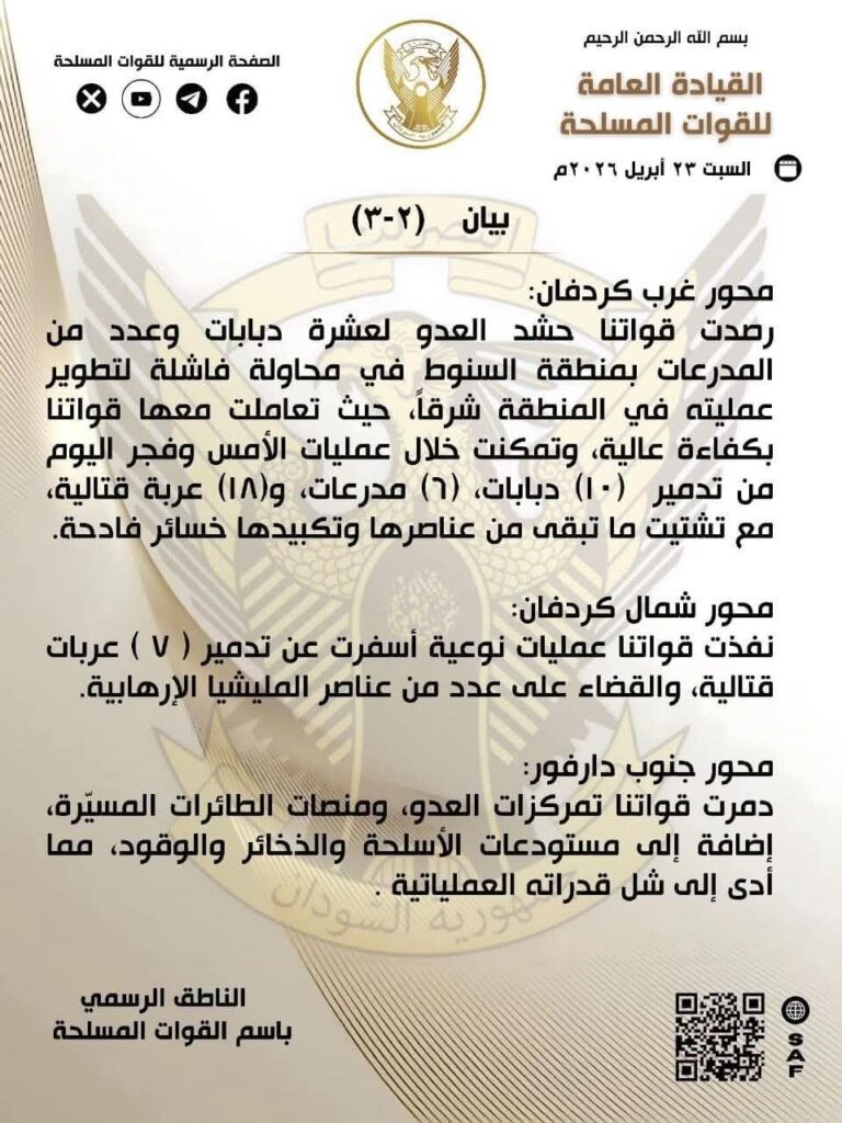 النورس نيوز _ أعلنت القوات المسلحة السودانية، اليوم الخميس 23 أبريل 2026م، تنفيذ سلسلة عمليات عسكرية وصفتها بالنوعية خلال الـ(72) ساعة الماضية في عدد من محاور القتال، مؤكدة تحقيق مكاسب ميدانية وتكبيد ما أسمتها بـ”المليشيا الإرهابية” خسائر كبيرة في الأرواح والعتاد.