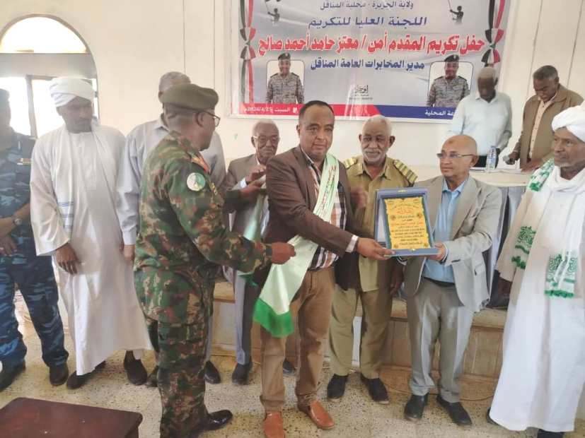 المناقل: يسرية أحمد علي- ودّعت محلية المناقل بولاية الجزيرة اليوم السبت، أحد أبنائها الأوفياء، مدير جهاز المخابرات العامة بالمحلية المقدم أمن معتز حامد أحمد صالح، في احتفال مهيب أقيم بمقر المحلية لتكريمه ووداعه، وسط حضور رسمي وشعبي غير مسبوق.